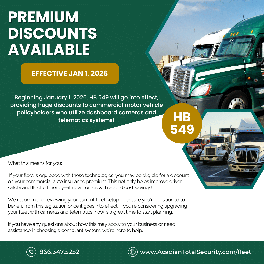 Drive Safer, Save More: Louisiana's New Bill Rewards Smart Driving with Dash Cams & Telematics! Here at Acadian Total Security, we're always looking for ...